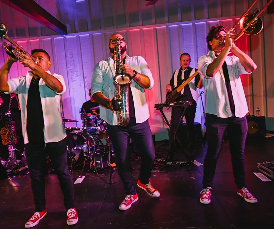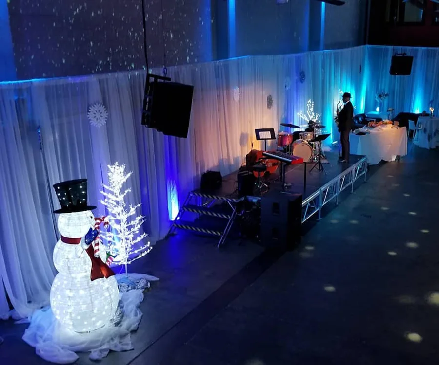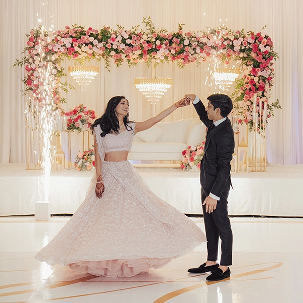 Music, dance, bright lights, and an elegant backdrop help to create a lively celebration atmosphere.